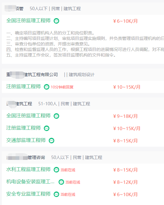 监理工程师的专业性和技术要求较高,市场上对监理工程师的薪资待遇相对较好。如图: